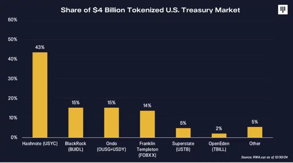 미국 재무부에 따르면 스테이블코인 담보 중 1,200억 달러가 미국 국채에 직접 투자되어 단기 증권에 대한 수요가 증가하고 있습니다. [ 3 ] 스테이블코인 외에도 미국 국채의 직접 토큰화도 증가하는 추세입니다. Securitize를 통한 BlackRock, Franklin Templeton, Hashnote 및 Pantera 포트폴리오 회사인 Ondo와 같은 회사가 이 40억 달러 규모의 시장을 주도하고 있습니다.