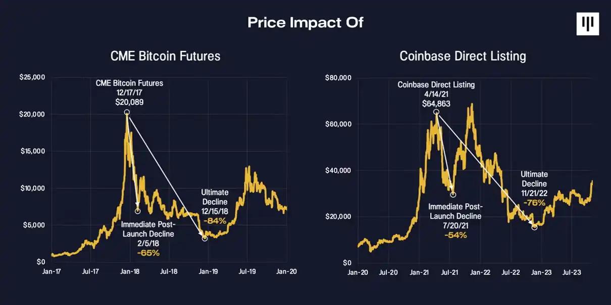 1년 전, 우리는 다가오는 비트코인 ETF: 소문을 구매하고 뉴스를 구매라는 제목의 11월 블록체인 레터를 발행했습니다. 우리는 CME 비트코인 선물 출시와 코인베이스 공개 상장 앞두고 "소문에 매수하고 뉴스에 매수하라"는 오래된 격언이 완벽하게 작동했지만 현물 비트코인 ETF 출시에는 적용되지 않을 것이라고 믿습니다.