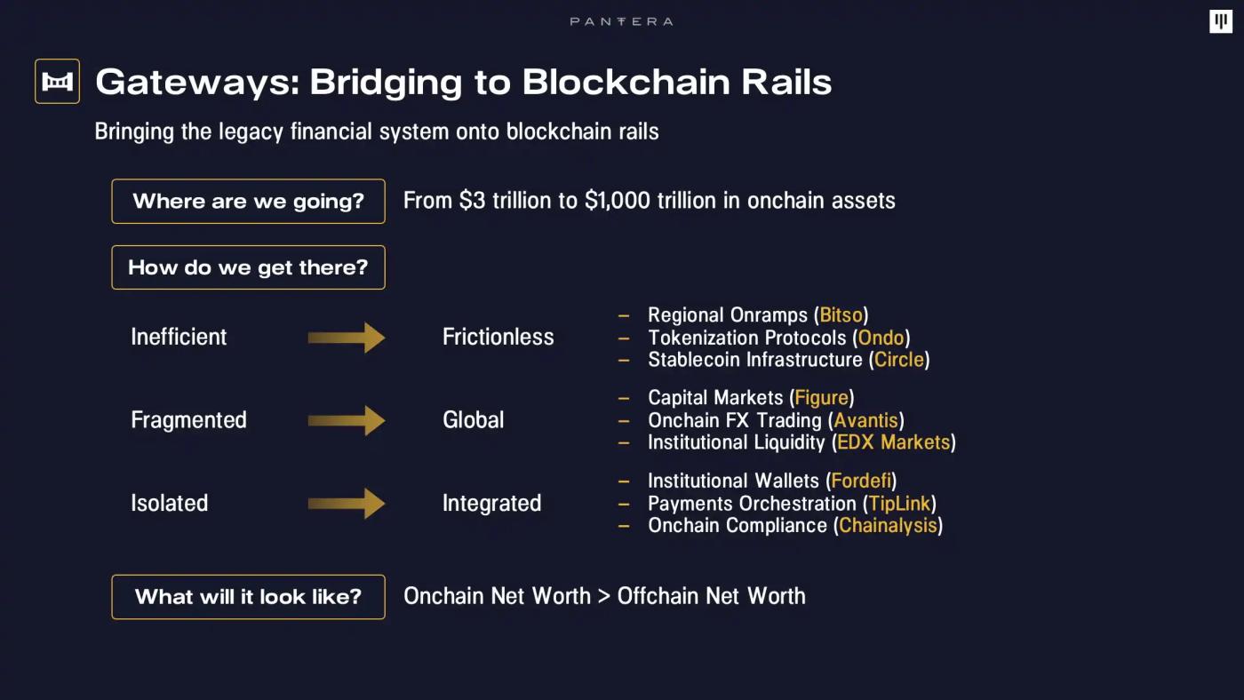 새로운 사용자와 기존 자산을 효과적으로 온보딩하려면 플랫폼을 확장해야 합니다. 예를 들어, 라틴 아메리카의 Bitso는 지역 포털로서 블록체인을 사용하여 미국-멕시코 송금의 10% 이상을 처리했습니다. Ondo와 같은 토큰화 플랫폼은 미국 국채 20조 달러를 온체인 가져오는 것을 목표로 Franklin Templeton 및 BlackRock과 정면 대결을 벌이고 있습니다.