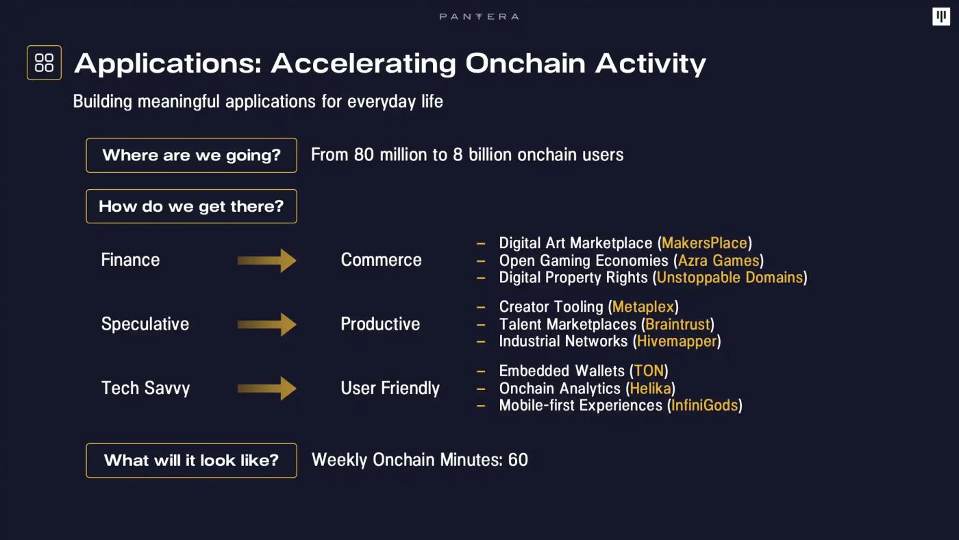 우리가 인터넷에서 애플리케이션을 전환하는 것처럼 사람들은 엔터테인먼트, 소셜 네트워킹, 돈 버는 등 다양한 이유로 온체인 시간을 보낼 것입니다. 그때쯤이면 온체인 경제가 점차 우리 일상생활에 통합될 것입니다.