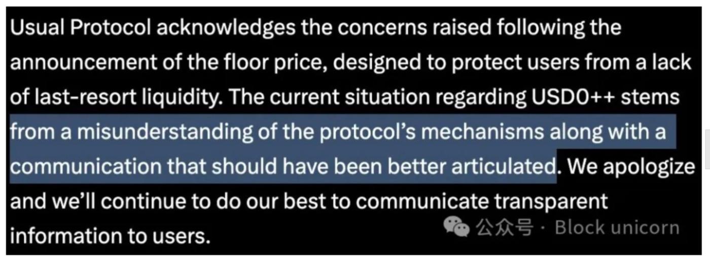 유동성 마이닝 참여자들에게 사전 경고를 주고 탈출할 기회를 제공하는 대신, Usual 팀은 실제로 자신의 사용자들과 Usual 자산을 사용하는 모든 관련자들에게 "기습"을 가했습니다. @GauntletXYZ에 따르면 미동부 시간 오후 4시 56분, Usual은 텔레그램 채팅을 통해 Gauntlet과 다른 @MorphoLabs 관리자들에게 USD0++의 일차 시장 무조건 1:1 환매 메커니즘이 즉시 종료된다고 통지했습니다. 또한 팀은 공개 트윗을 통해 이 변화를 발표하고 0.87달러 하한가의 가격 보호 메커니즘과 USD0로 전환할 수 있는 1:1 조기 해제 메커니즘을 도입할 것이라고 밝혔습니다.
