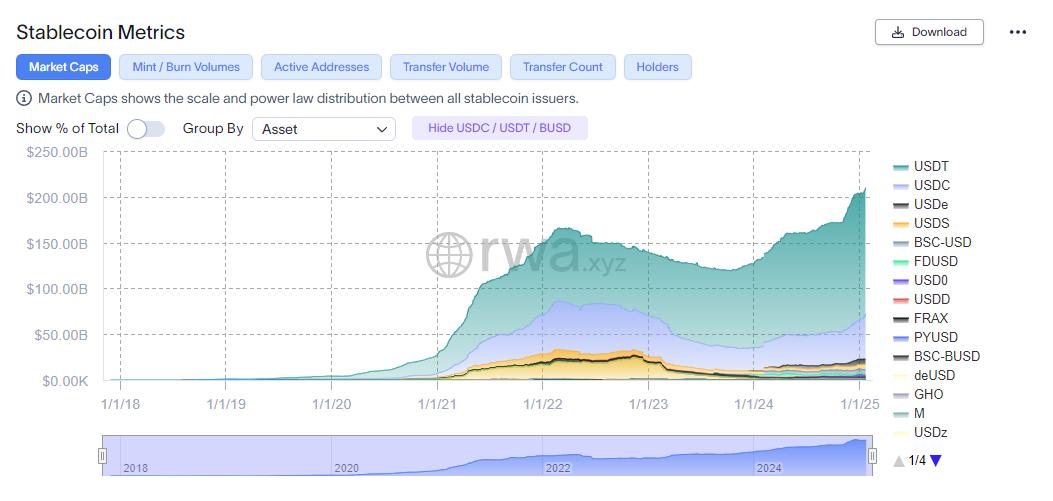 RWA는 스테이블코인, 민간 신용, 미국 국채, 원자재, 주식 등을 포함한 광범위한 자산 클래스를 다루고 있습니다. 이러한 자산 중 스테이블코인은 고유성과 중요성으로 인해 독립적인 트랙으로 간주될 수 있습니다. 불안정 통화 RWA의 경우 자산 표준화의 복잡성과 불완전한 정책 및 규제로 인해 규모가 상대적으로 작으므로 안정적인 통화 분야에 중점을 둘 것입니다.