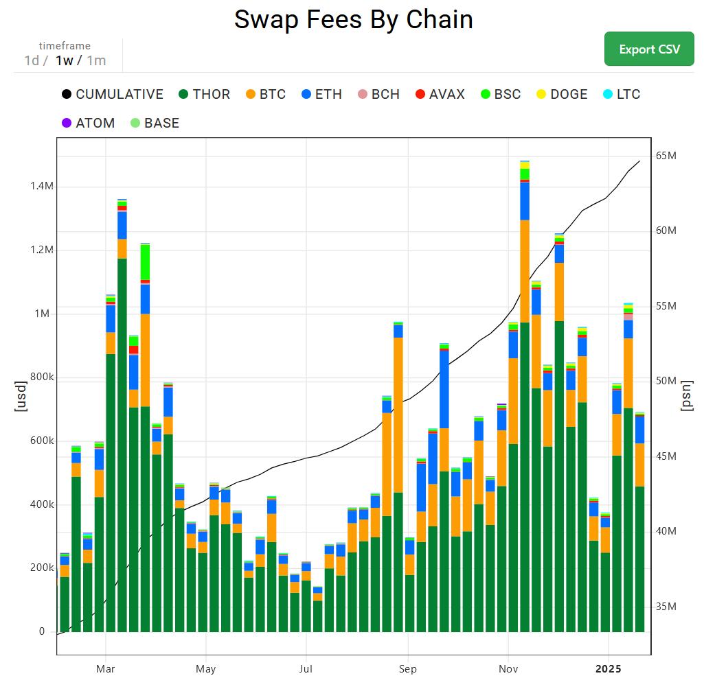 THORSwap, 토르체인의 본래 사용 사례는 정상 작동 중입니다. 주간 거래량 500-600억 달러를 기록하고 지난 주 약 70만 달러의 수수료를 창출했습니다.