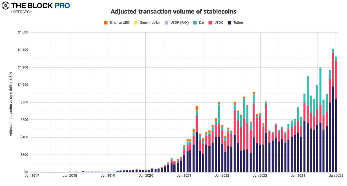 2/12 스테이블코인의 조정된 거래량 거래량 6.3% 감소하여 1.32조 달러에 도달했습니다. 발행 공급량은 3.1% 증가하여 새로운 신고가 인 1,752억 달러에 도달했으며, 테더 USDT(USDT) 각각 78%, USDC는 19.6%의 시장 점유율을 기록했습니다.