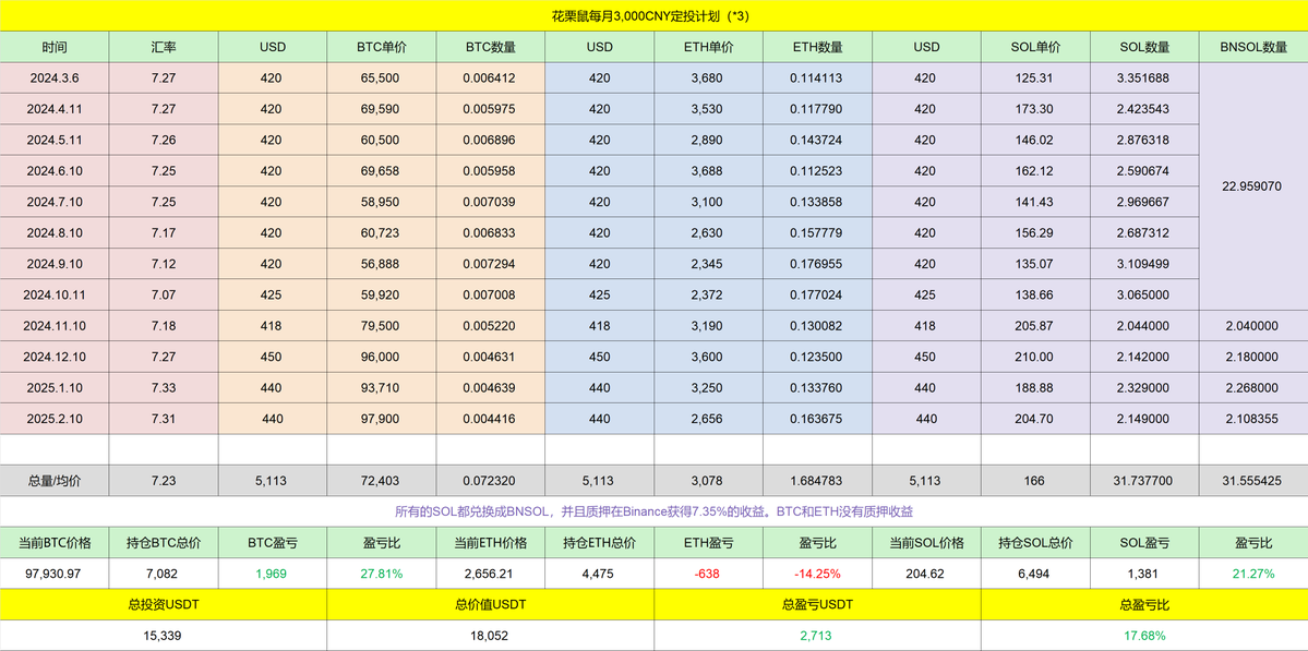 整整一年了,从2024年3月推荐买 <#BTC> 被小伙伴说不赚钱就开始做了这个测试,就是像试试普通家庭每个月拿出3,000人民币做加密货币定投的话,是不是能赚钱,能赚多少钱,能不能跑赢标普的收益率,能不能跑赢<美债>的收益了,能不能跑赢人民币定存的收益率。 开始就定投 2+1 个分别是 <#BTC> 和 <#ETH> 以及 <#HT>... <x.com/i/web/status/18889032121...> <twitter.com/Phyrex_Ni/status/1...>