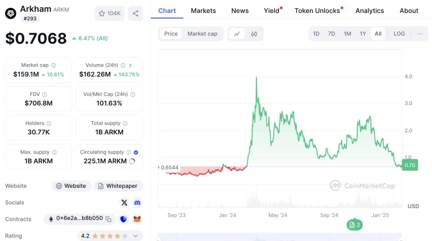 아르카움(Arkham)도 카이토(Kaito)와 마찬가지로 AI 데이터 도구로 분류되며, 목표는 기술적 수단을 통해 암호화 세계의 정보 파편화 문제를 분석하고 사용자에게 '알파 기회'를 제공하는 것입니다. 다른 점은 카이토가 소셜 데이터에 더 치중되어 있는 반면, 아르카움은 온체인 데이터에 초점을 맞추고 있습니다. 그렇다면 데이터 도구에 최초로 토큰을 발행한 아르카움의 현황은 어떨까요? 가격 면에서 보면 시장 데이터에 따르면 $ARKM의 현재 가격은 0.71달러이며, 역대 최고가는 2024년 3월 10일의 3.12달러였습니다. 현재 가격은 약 80% 하락했으며, 상당한 변동성을 보이고 있습니다. AI 프로젝트로 분류되었기 때문인지, 가격은 전체 AI 섹터의 부침에 따라 변동되고 있습니다.