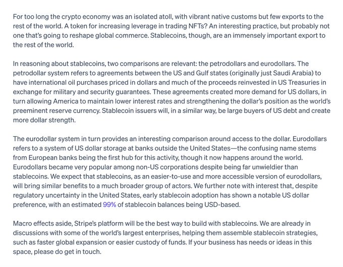 "우리는 이미 세계 최대 기업들과 논의를 진행하고 있으며, 이들이 <더 빠른 글로벌 확장> 또는 <자금 보관의 용이성>과 같은 <스테이블코인> 전략을 구축하는 것을 돕고 있습니다." <스테이블코인>에 관한 @patrickc와 @collision의 Stripe 2024 서신