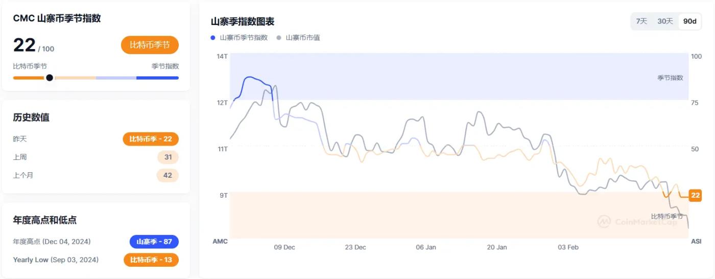 체인캐처(ChainCatcher) 메시지에 따르면 Coinmarketcap 데이터에 따르면 알트코인 시즌 지수(Altcoin Season Index)가 현재 22를 기록하며 전일과 동일한 수준을 유지하고 있습니다. 이 지수는 지난 90일 동안 시가총액 상위 100대 암호화폐 중 약 22개 프로젝트가 비트코인을 능가하는 상승률을 기록했음을 보여줍니다.