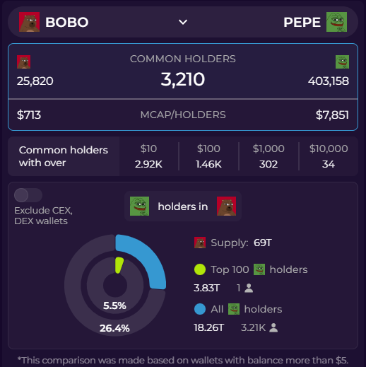 모든 디젠(Degen)의 첫 번째 증오, 마지막 사랑 🔗http:/comparemarketcap.com/hol...… 페페(PEPE) 홀더는 총 보보코인(BOBO) (@bobocoineth) 공급량의 26.4%를 보유하고 있습니다.