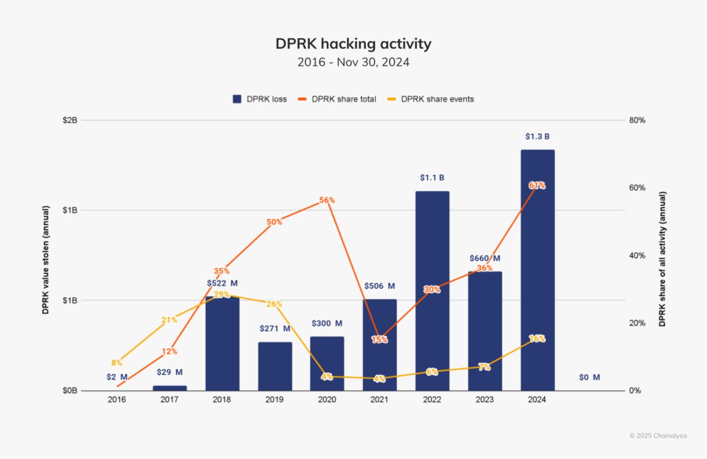 우리의 2025년 암호화폐 범죄 보고서의 최근 조사 결과에 따르면 우려스러운 추세가 나타났습니다. 북한 계열 해커들은 2023년 20건의 사건에서 약 6억 6,050만 달러를 훼손했습니다. 2024년에는 47건의 사건에서 13억 4,000만 달러로 증가했는데, 이는 전년 대비 102.88% 증가한 수치입니다. 바이비트 해킹 단독으로도 DPRK 해커들이 전년 내내 훼손한 것보다 많은 금액을 차지했습니다. 이는 업계 전반에 걸쳐 강화된 보안 조치가 시급함을 강조합니다.