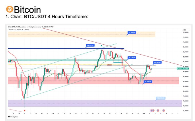 비트코인(BTC)-테더 USDT(USDT) 4시간 차트: 2025년 4월 2일 📈📉 시장 업데이트: 4시간 차트에서 비트코인의 가격은 현재 약 84,629달러를 기록하고 있습니다. 비트코인(BTC)은 최근 81,400달러의 중요한 지지선에서 반등하며 상단 저항선에 도전하고 있습니다.