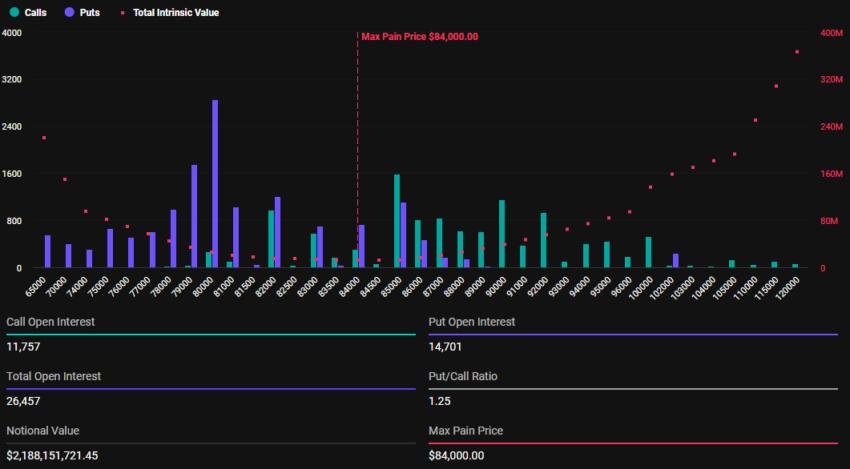 데리빗(Deribit) 데이터에 따르면, 오늘 26,457개의 비트코인 옵션이 만료될 예정이며, 이는 지난주 1분기 마감 시 139,260개의 BTC 계약보다 크게 낮습니다. 오늘 만료되는 옵션 계약은 풋-콜 비율이 1.25이고 최대 통증 지점은 84,000달러입니다.