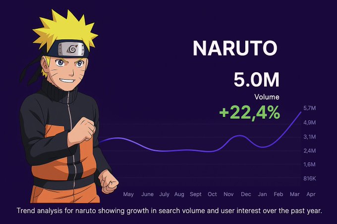 나루토 검색 관심도는 전년 대비 22.4% 급증하여 4월에 500만 건을 기록했습니다.