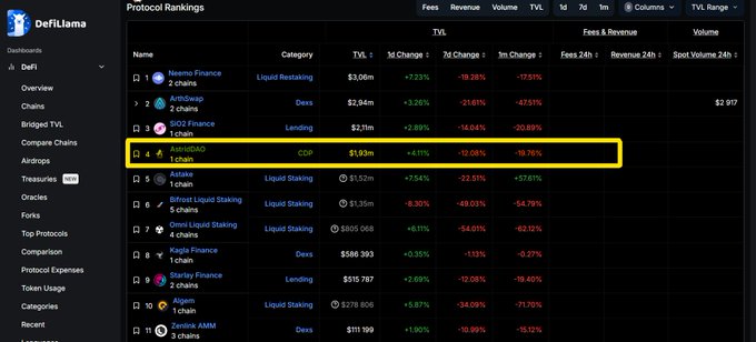 아스트리드 분산형 자율 조직(DAO)이 현재 <@AstarNetwork>의 디파이 디앱(DApp) 순위에서 4위를 차지하고 있습니다! <@DefiLlama>를 통해 확인되었습니다. 우리의 파트너 <@SiO2_Finance>와 함께 자랑스럽게 서 있으며 — 우리의 놀라운 커뮤니티에 큰 감사를 드립니다! 🙌