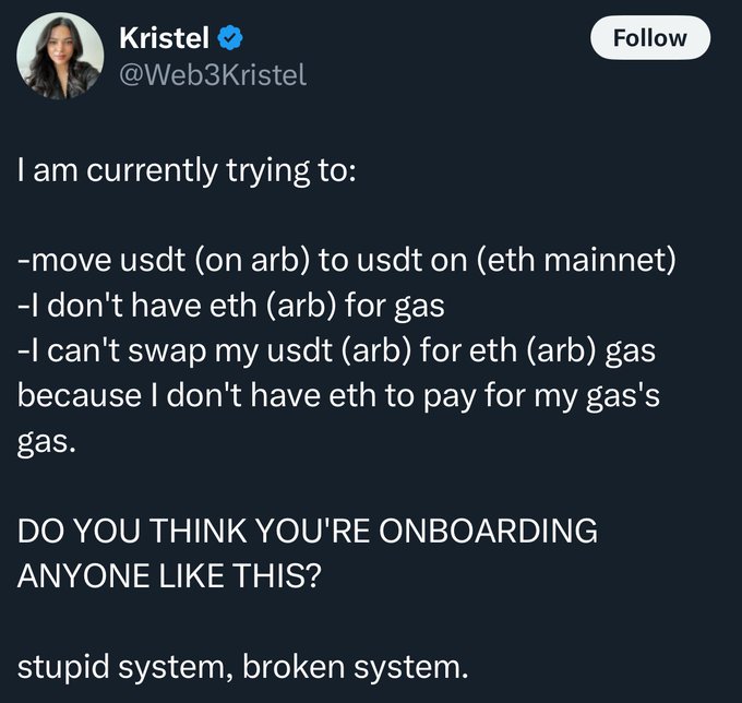 이 트윗은 거의 20만 뷰를 받았습니다 그리고 저는 전적으로 동의합니다 하지만 해결책이 있습니다: <@SlingshotCrypto> 1. 신용카드, 암호화폐 지갑, 애플 페이, 중앙화 거래소(CEX), 벤모 등을 통해 USDC 예치 2. 어떤 체인에서든 모든 토큰 거래: 브릿징, 가스 등 없이