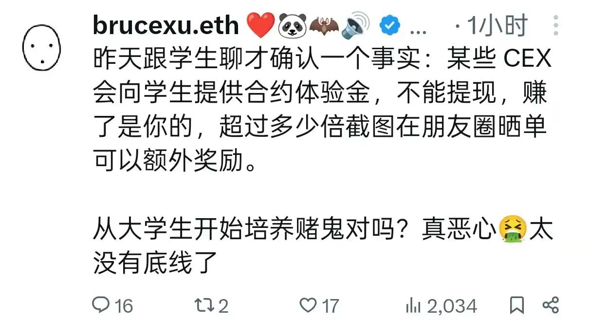 최근 이더리움(ETH)Panda, LXDAO 공동 창립자 Brucexu.eth는 소셜 플랫폼에서 일부 코인업계 거래 플랫폼이 대학생들에게 소위 "계약 체험금"을 제공하고 있는 상황을 폭로했습니다. 이러한 체험금은 직접 인출할 수 없으며, 수익이 발생하면 학생에게 귀속되고, 손실이 발생해도 상환할 필요가 없으며, 친구 그룹에서 높은 수익을 자랑하면 추가 인센티브를 받을 수 있습니다.