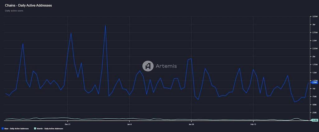 하지만 레이어 2로서 맨틀의 성능은 완벽하지 않으며, 선두 레이어 2 네트워크인 베이스(Base)와 큰 격차를 보입니다. 예를 들어, 맨틀의 일일 활성 지갑 주소 수는 약 1만 개에 불과한 반면, 베이스는 120만 개로, 120배 이상의 차이가 납니다.