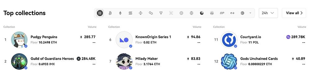 OKX의 NFT, 비문, 룬 마켓은 업계를 선도하고 있으며, 풍부한 다양성과 5천만 달러 이상의 일일 최대 거래량을 기록하며 한때 Blur를 능가하기도 했습니다. OKX의 NFT 마켓플레이스는 0% 상장 수수료 할인을 제공하며, 이는 사용자 유치의 주요 장점으로 자리 잡았습니다. OKX는 이더리움, zkSync, Polygon, Solana 등 20개 이상의 퍼블릭 체인과 Tensor, OpenSea, Magic Eden 등 30개 이상의 NFT 플랫폼을 통합하여 사용자에게 최적의 호가와 유동성을 제공하여 크로스 체인 거래 운영을 간소화합니다.