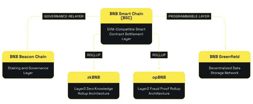 BNB 체인은 BNB 비콘 체인(BC), BNB 스마트 체인(BSC), BNB 그린필드를 주로 포함하는 멀티 체인 아키텍처 시스템이며, 두 가지 L2 스케일링 솔루션인 opBNB와 zkBNB를 통해 성능이 향상되었습니다.
