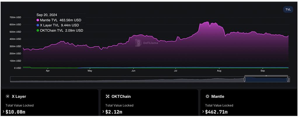 - OKT 체인과 X 레이어의 TVL(총 잠금 가치)은 상대적으로 낮습니다.