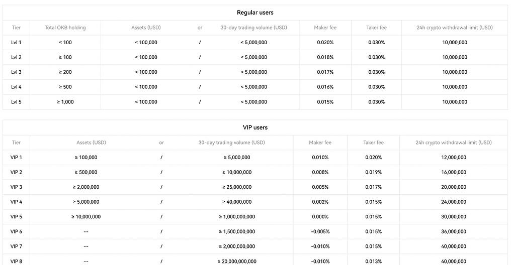 일반 사용자 : 계정 레벨은 사용자가 보유한 OKB 수 또는 30일 거래량을 기준으로 구분됩니다. 레벨 1부터 레벨 5까지, 보유한 OKB 수 또는 거래량이 많을수록 사용자가 누리는 거래 수수료가 낮아집니다. 메이커 수수료는 0.020%에서 0.015%로, 테이커 수수료는 0.050%에서 0.030%로 인하됩니다. 24시간 암호화폐 출금 한도는 사용자 레벨당 1,000만 달러로 유지됩니다.