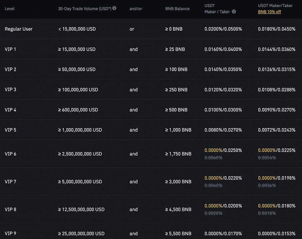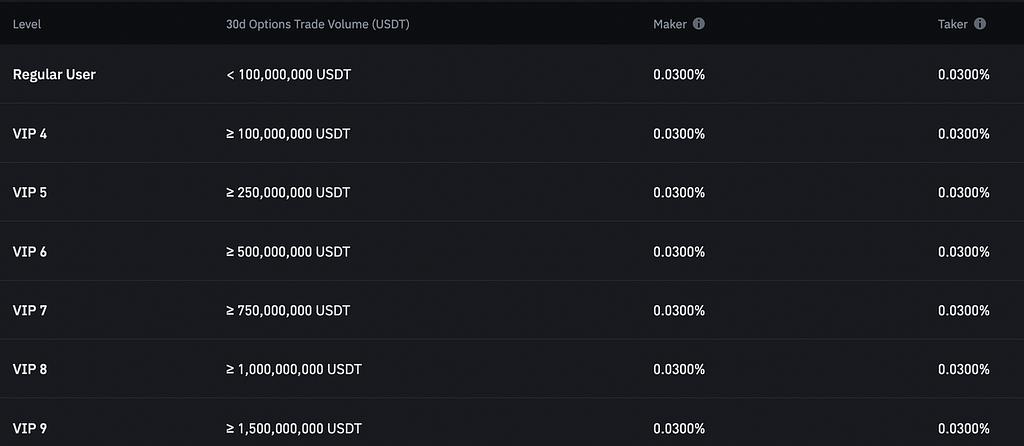 바이낸스 옵션 거래 수수료 구조는 사용자의 30일 거래량을 기준으로 순위가 매겨집니다. 모든 사용자의 메이커 또는 테이커 수수료는 0.03%입니다.
