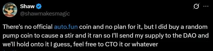 체인캐처(ChainCatcher) 소식에 따르면, a16z 창립자 쇼는 "pump.fun에서 FUN이라는 토큰 구매"와 관련해 트윗을 통해 "현재 공식 auto.fun 토큰은 출시되지 않았고, 관련 계획도 없으며, 구매한 토큰은 단순히 마케팅용이다. 나는 내 공급량을 분산형 자율 조직(DAO)에 보낼 것이며, 우리가 이를 보유할 것으로 생각한다. CTO나 다른 직책으로 자유롭게 활용할 수 있다."라고 밝혔다.