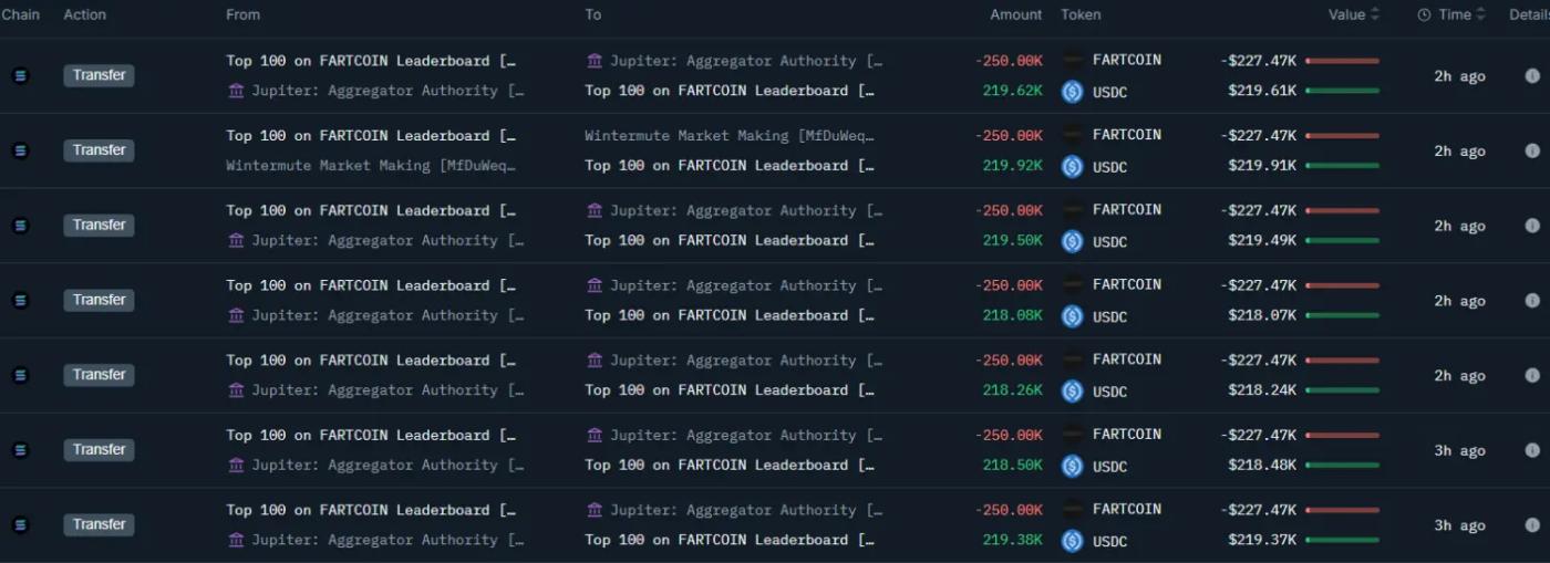 체인캐처(ChainCatcher) 소식에 따르면, 온체인 분석가 온체인 렌즈(@OnchainLens)의 모니터링 결과, 지난 4시간 동안 한 고래 투자자가 0.876달러의 가격으로 400만 개의 FARTCOIN을 매도했으며, 그 가치는 350만 달러에 달합니다. 해당 지갑에는 여전히 100만 달러 상당의 FARTCOIN, 즉 90.5만 달러어치가 남아있습니다.