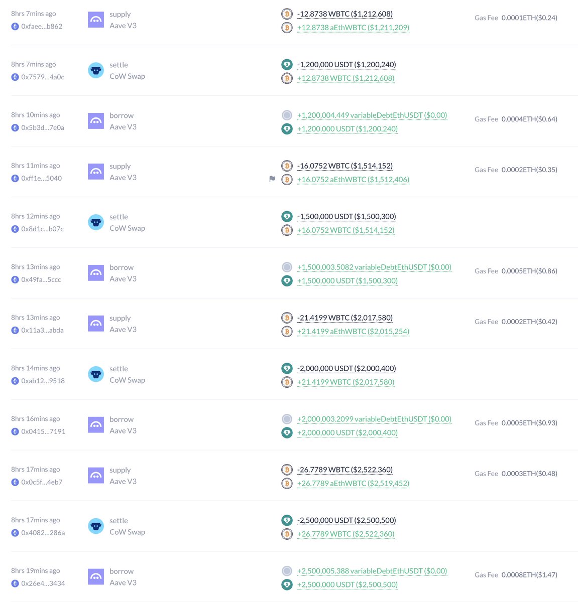 한 고래가 8시간 전에 아베(AAVE)에서 순환 대출 방식으로 1,020만 테더 USDT(USDT)를 대출받아 109.2개의 WBTC를 $93,331에 매수했습니다. 현재 그는 총 256.2개의 WBTC($24.12M)를 보유하고 있으며, 평균 매수 단가는 $87,162입니다. 하지만 비트코인(BTC)에 대한 그의 롱(Long) 포지션의 건전성 비율은 다소 낮아 1.14에 불과합니다. 해당 청산 가격은 $82,457입니다. <debank.com/profile/0x931433324...> 본문은