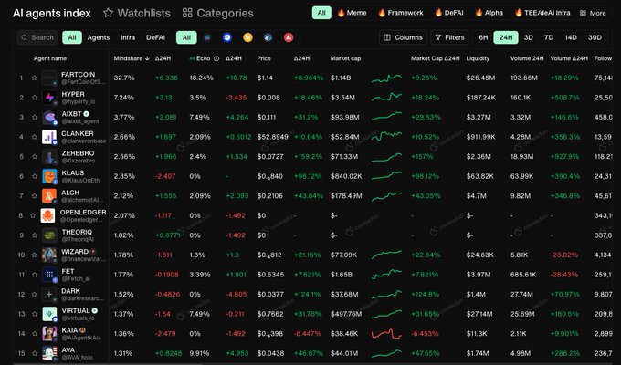 AI 에이전트 시장 분석: 마인드쉐어, 시가총액, 거래량 (4월 23일, 24시간 개요) [AI] 불 시장이 다시 돌아왔을까? 비트코인(Bit)이 9만 4천 달러로 급등하고 이더리움(ETH)은 1,800달러를 기록하며, 대체 코인 시장은 AI 코인과 유틸리티 코인에 유리한 상황이다! 주요 화두: i) FARTCOIN