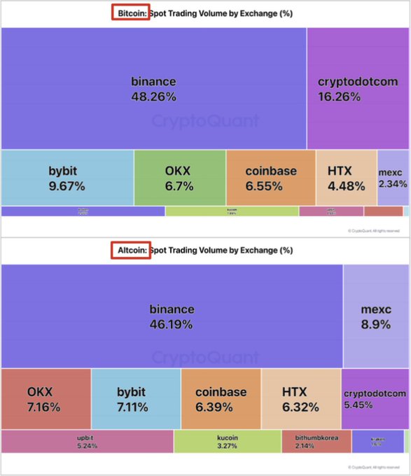 바이낸스가 시장을 주도하고 있습니다 비트코인(BTC)과 알트코인의 현물 거래량 거의 50%가 한 플랫폼을 통해 흐르고 있습니다: 바이낸스 이 사실을 깊이 생각해보세요. 한 플랫폼이 시장의 절반을 차지하고 있습니다. 다른 모든 거래소를 합친 것보다 더 큽니다. 심지어 변동성 있는 시장에서도 바이낸스의 점유율은 30%에서