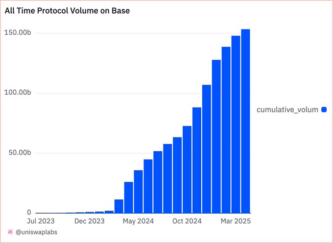 베이스는 유니스왑(Uniswap) 프로토콜에서 누적 거래량 1,500억 달러를 돌파했습니다 1년 전 오늘 그 수치는 겨우 260억 달러였습니다 베이스 가속화 🔵
