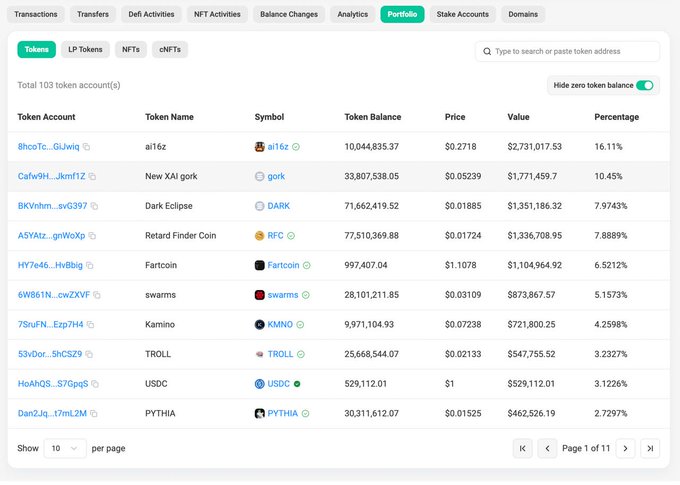 Solscan에서 해당 고래의 지갑이 열리고, 처음에 가지고 있던 코인뿐만 아니라 고래가 보유하고 있는 다른 모든 코인을 볼 수 있습니다.