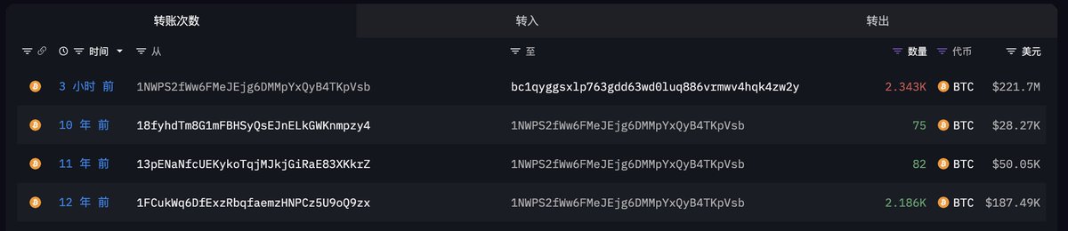 12년 동안 움직이지 않았던 3,422개의 비트코인(BTC)이 지난 3시간 동안 새 주소로 이동되었으며, 그 가치는 3억 2,400만 달러입니다. 거슬러 올라가 보면 이 비트코인(BTC)은 최초로 2012년에 BTC-e 거래소(가장 오래된 거래소 중 하나로, 현재 폐쇄됨)에서 인출되었으며, 당시 비트코인(BTC) 가격은 단 13.5달러였습니다. 이 3,422개의 비트코인(BTC)은 처음에는 4만 6,000달러의 가치였지만, 현재는 3억 2,400만 달러로, 7,018배 증가했습니다.