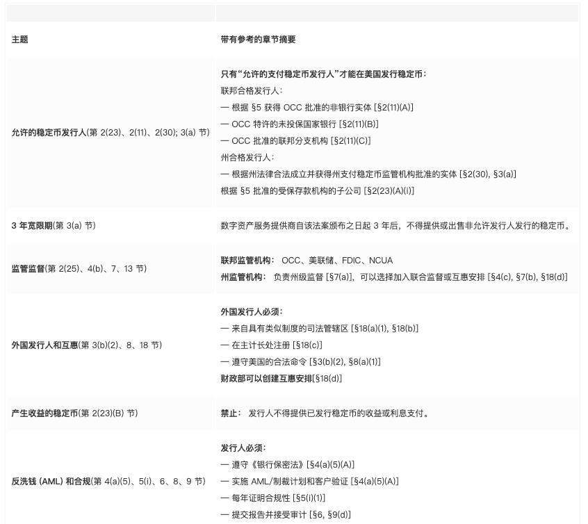 대체로 이 법안은 미국에서 스테이블코인 발행에 대한 엄격하게 규제된 프레임 만들어냅니다 .