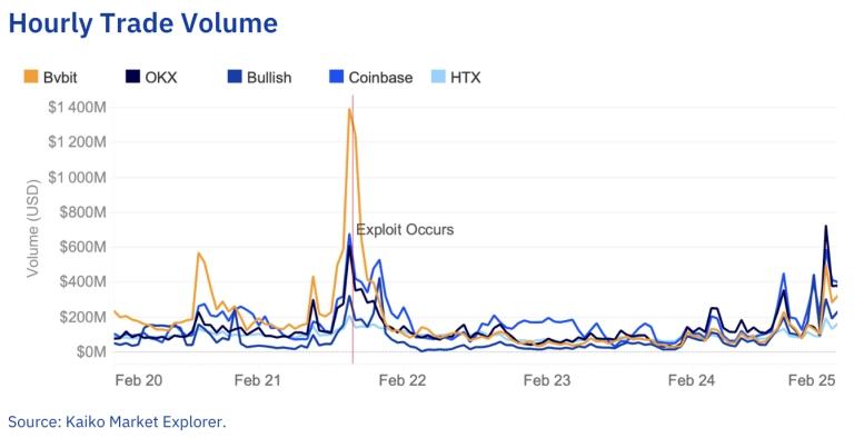 거시경제적 불확실성으로 전체 시장 정서가 신중해졌음에도 불구하고, 바이비트(Bybit)의 거래량은 2016년 비트파이넥스(Bitfinex) 해킹 사건이나 2023년 바이낸스.US의 SEC 사건과 같은 과거 유사 사건보다 더 빠르게 회복되었습니다.