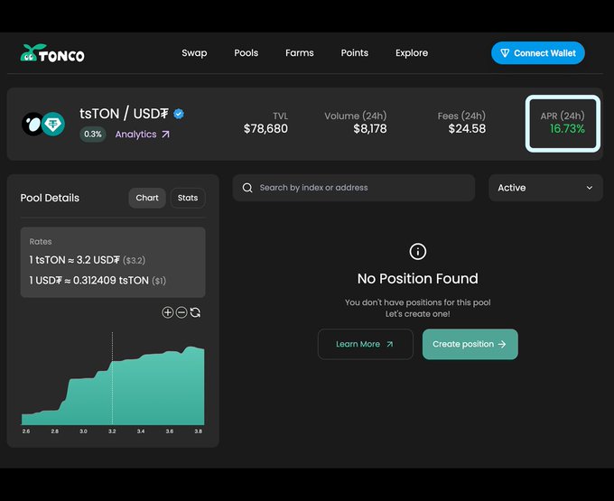 그리고 최고의 자리는? @Tonco_io, 탈중앙화 거래소(DEX) — 여기서 tsTON/테더 USDT(USDT)를 제공하면 일반 스테이킹에 추가로 약 16.7%의 연간 수익률을 얻을 수 있으며, 총 약 20%에 도달합니다!