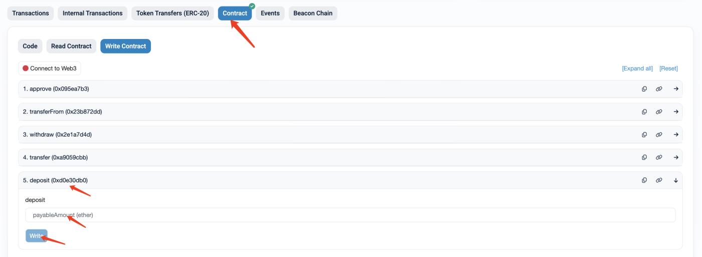 2단계. 홀레스키(Holesky)와 세폴리아(Sepolia) 테스트넷의 이더리움(ETH)을 WETH로 교환(교환 링크: https://sepolia.etherscan.io/token/0x7b79995e5f793a07bc00c21412e50ecae098e7f9#writeContract , https://holesky.etherscan.io/address/0x94373a4919B3240D86eA41593D5eBa789FEF3848#writeContract).