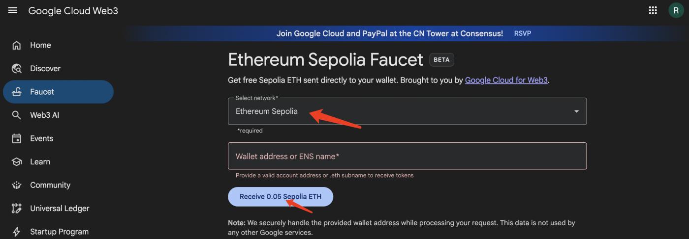 1단계. 홀레스키(Holesky)와 세폴리아(Sepolia) 테스트넷 토큰 획득(토큰 수령 링크: https://cloud.google.com/application/web3/faucet).