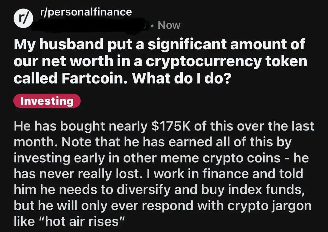 Fartcoin 밈: 제 남편은 가족 재산의 상당 부분을 Fartcoin이라는 암호화폐 토큰에 투자했습니다. 어떻게 해야 하나요?
