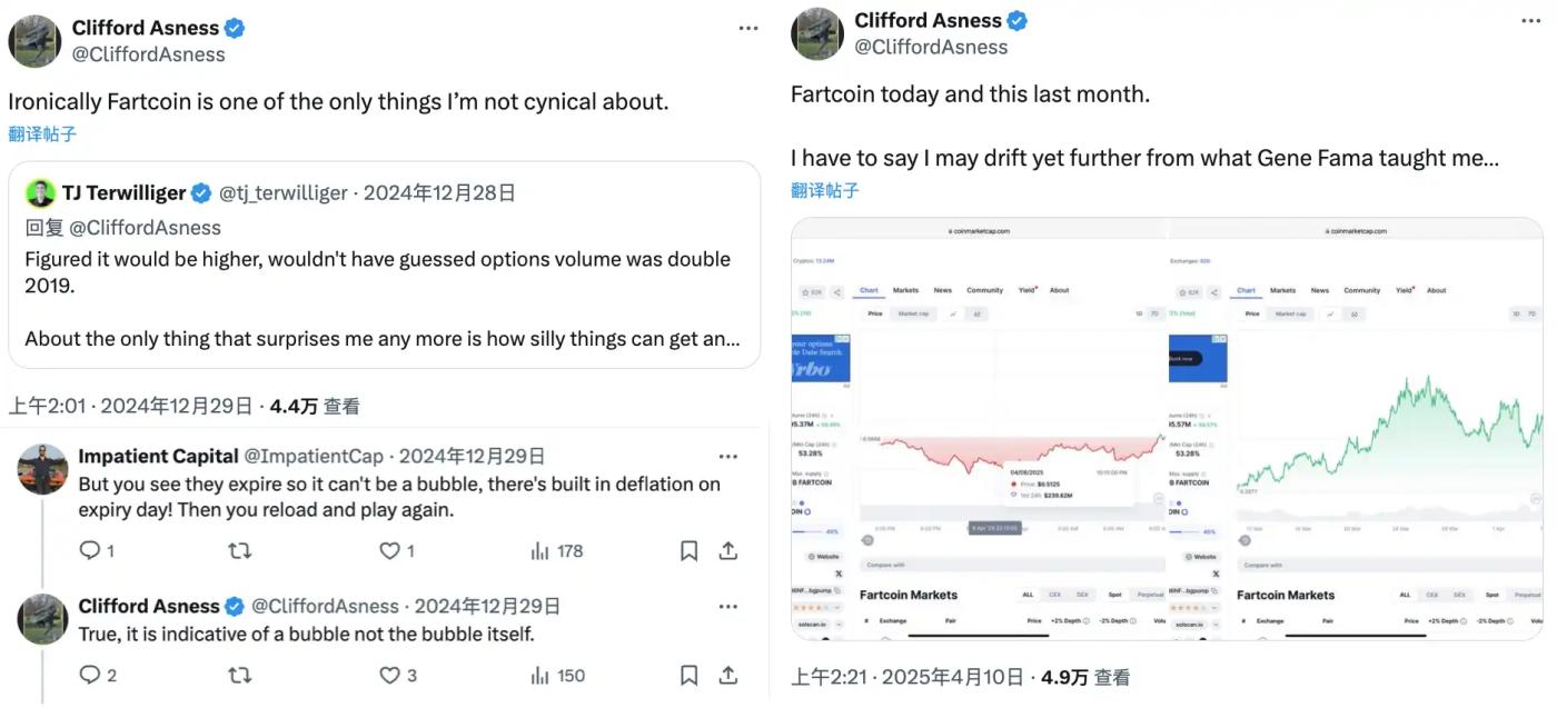 위의 두 사람이 여전히 분노와 자제력을 가지고 있다면, 억만장자 클리프 애스니스의 태도는 훨씬 더 느긋해 보인다. AQR Capital의 공동 창립자이자 전통 금융의 합리성을 대표하는 인물로, 항상 침착함과 요인 모델링으로 유명했지만, Fartcoin 대면 하자 갑자기 자신의 "합리적 인간 가정"을 접어두었습니다. 그는 소셜 미디어에 "아이러니하게도 Fartcoin은 제가 의심하지 않는 유일한 것입니다."라고 글을 올렸습니다. 당시 게시물의 맥락을 고려해 볼 때, 이는 전체 시장의 부조리를 가볍게 비판하는 것이었습니다.