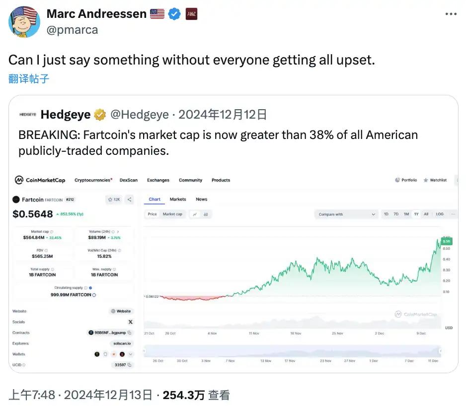 2024년 12월 13일, Fartcoin에 대한 조롱 트윗이 X(이전의 Twitter)에서 빠르게 퍼졌습니다. 이 트윗이 바이럴이 된 이유는 뛰어난 내용이 아니라, 이를 리트윗한 사람 때문이었습니다. 바로 a16z의 공동 창립자인 마크 앤드리슨입니다.