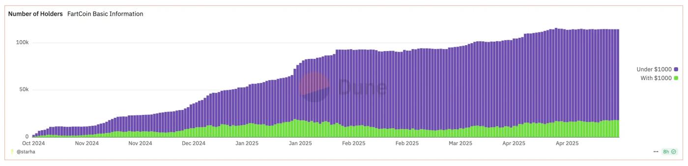 Dune과 BubbleMaps의 데이터에 따르면, 2025년 1월 3일부터 5월 9일까지 Fartcoin의 코인 구조는 초기 단계의 대형 투자자 집중에서 점차 개인 투자자 분산으로 확대되고 있습니다.