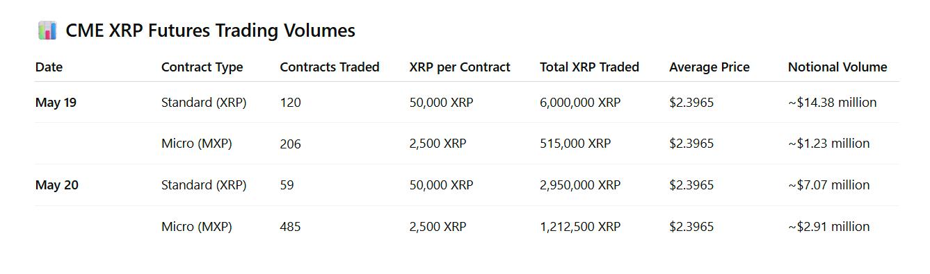 공식 CME 데이터와 확인된 보고서에 따르면, 5월 19일에 120개의 표준 계약과 206개의 마이크로 계약이 거래되어 약 650만 리플(XRP)을 기록했습니다.