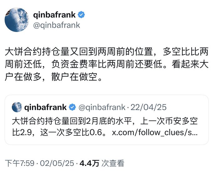 大饼合约持仓量又回到两周前的位置,多空比比两周前还低,负资金费率比两周前还要低。看起来大户在做多,散户在做空。 x.com/qinbafrank/sta…