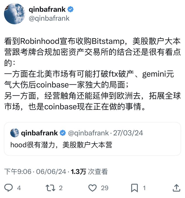 로빈후드는 최근 2년간 암호화폐 영역에서 인수를 자주 진행했습니다: 22년에 영국 암호화폐 플랫폼 지글루를 인수하고, 24년에는 유럽의 오래된 거래소 비트스탬프(Bitstamp)를 인수했으며, 최근에는 캐나다 디지털 자산 제품 및 서비스 제공업체 원더파이(WonderFi)를 인수했습니다. 2월에는 유니스왑(Uniswap)과 협력하여 탈중앙화 거래소(DEX) 사용자들이 로빈후드의 통합 서비스를 통해 암호화폐 자산을 USDC와 같은 스테이블코인 또는 이더리움(ETH)으로 전환하고 은행 계좌로 인출할 수 있게 했습니다.