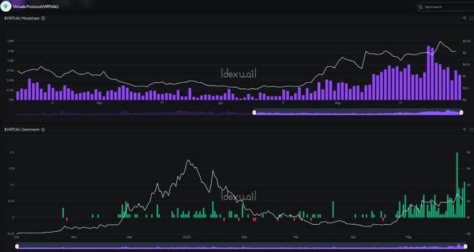 Yapper 리더보드 출시 이후 $VIRTUAL의 마인드셰어와 여론이 지역 최고치를 기록했습니다.