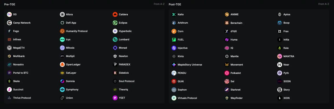 많은 프로젝트들이 Kaito와 협력하여 Kaito 플랫폼을 통해 또는 Kaito Yappers와 보유자들을 대상으로 에어드랍을 진행하여 커뮤니티 참여와 홍보를 장려하고 있다. 다음은 Kaito 사용자와 Yappers에게 에어드랍 점유율을 할당한 것으로 알려진 암호화폐 프로젝트들이다:
