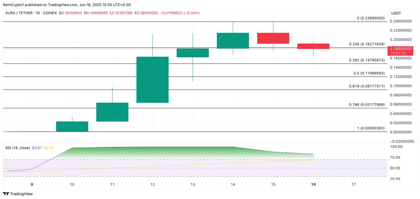 어제 이 알트코인은 $0.23의 역대 최고가를 기록했으나, 이후 25% 하락했습니다. 현재 AURA는 $0.18에 거래되고 있습니다.