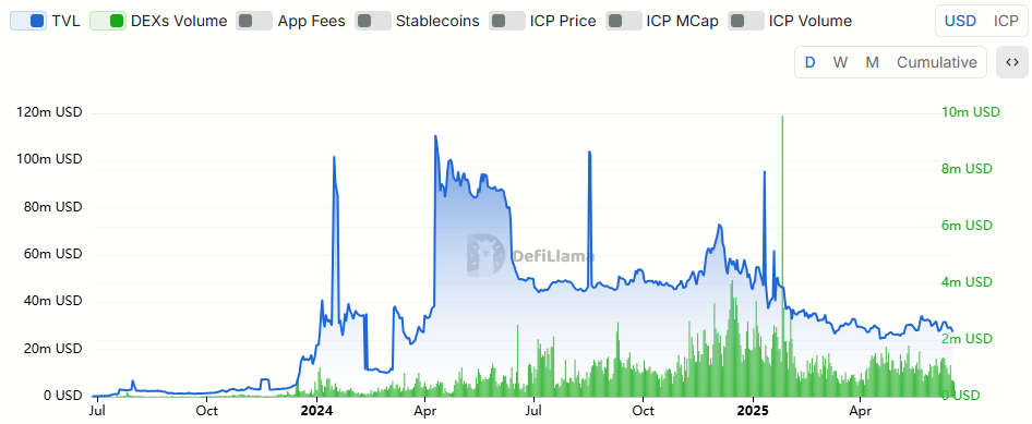 인터넷 컴퓨터(ICP) 의 온체인 활동도 여전히 침체되어 있습니다. 디파이라마(defillama) 데이터에 따르면 네트워크에 TVL(Total Value Locked) 2025년 초부터 꾸준히 감소하고 있으며, 1월의 5,500만 달러에서 6월의 2,700만 달러로 50% 이상 감소했습니다.